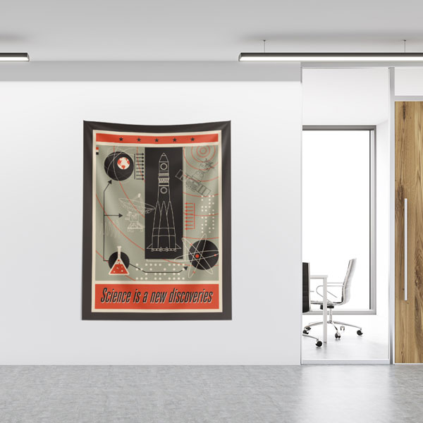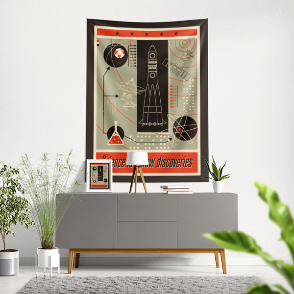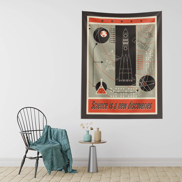 retro, uzay, keşif, bilim, inovasyon, poster, roket, uydu, laboratuvar, eğitim, okul, sınıf, duvar örtüsü, duvar flaması, kumaş baskı, dijital baskı, dekoratif baskı
